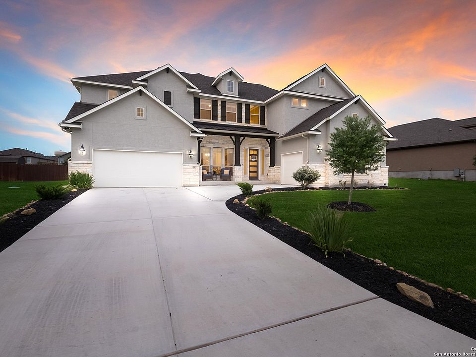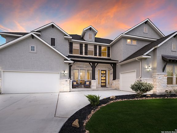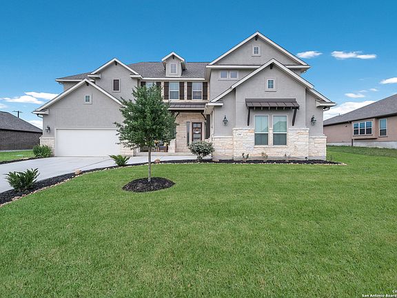 Located in the highly rated Schertz Cibolo Universal City ISD, this beautiful 2-story home, situated on a .55 acre lot offers a luxurious and tranquil retreat for its residents. When you first walk up to the home, you will notice the charming curb appeal! With 5 bedrooms and 4 1/2 baths, this spacious residence is perfect for families or those who love to entertain. As soon as you enter the home, you will fall in love with the hardwood flooring, tall ceilings and the open floor plan that makes this home an entertainer's dream! The chefs kitchen greets you with stunning white cabinetry paired with quartz countertops, gas cooking with pot filler, SS appliances and an oversized kitchen island with bar seating! . The family room includes a gorgeous fireplace and two story windows allowing the natural light to shine through. The spacious primary suite is located on the first floor, the primary bath includes a large walk-in shower, separate garden tub, and walk-in closet. This stunning home has a first-floor guest suite with en-suite bathroom. Upstairs is a grand media room complete with a media package for home theatre. The possibilities are endless in this home! Enjoy your backyard paradise as you relax on your extended covered patio. Centrally located within 20 minutes from downtown San Antonio and the San Antonio International Airport. 5 miles from Randolph AFB, 12 miles from Fort Sam Houston, 23 miles from Kelly, and 24 miles from Lackland.