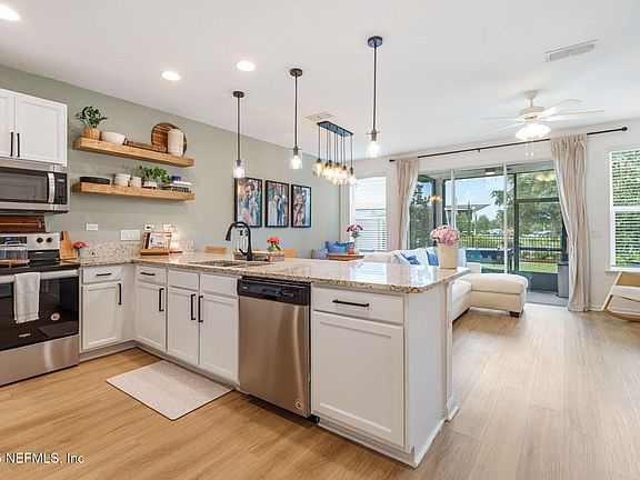 Inside, you'll find 2 oversized bedroom suites — each with its own bathroom and walk-in closet — plus a third bathroom downstairs for guests. The open kitchen boasts white cabinetry, floating shelves, pendant lighting, and trendy accent walls. Luxury vinyl plank flooring runs throughout, giving a fresh and modern feel.