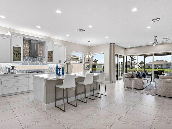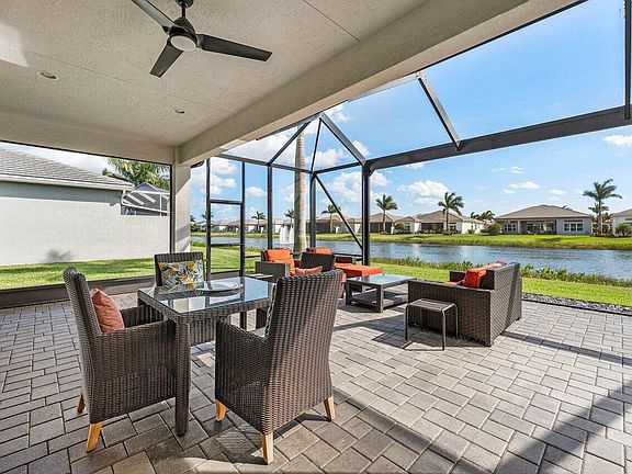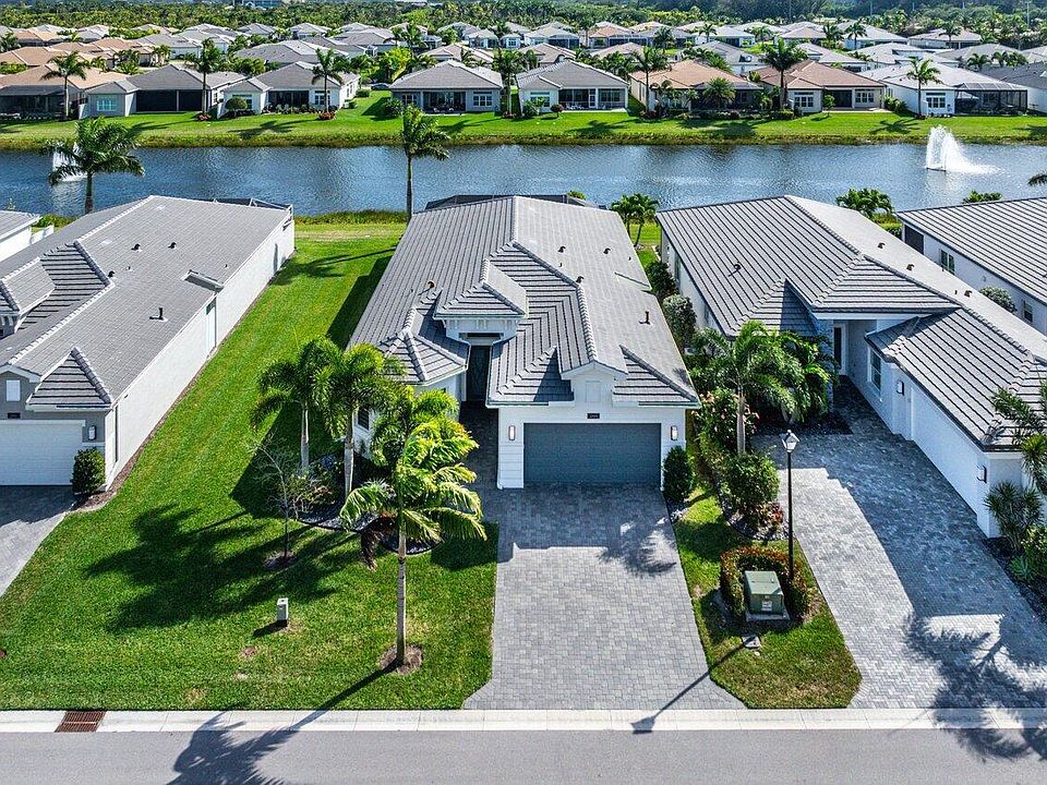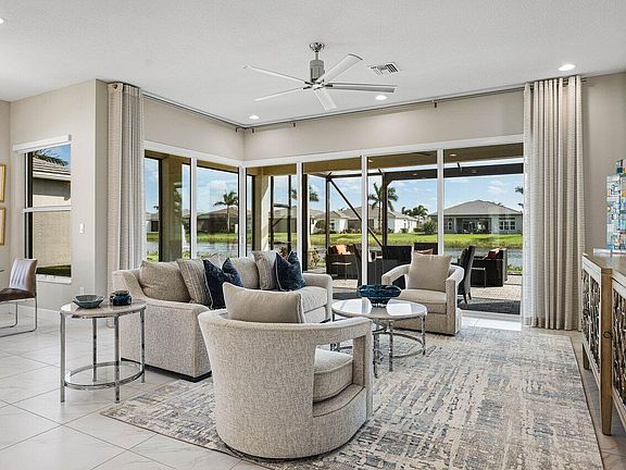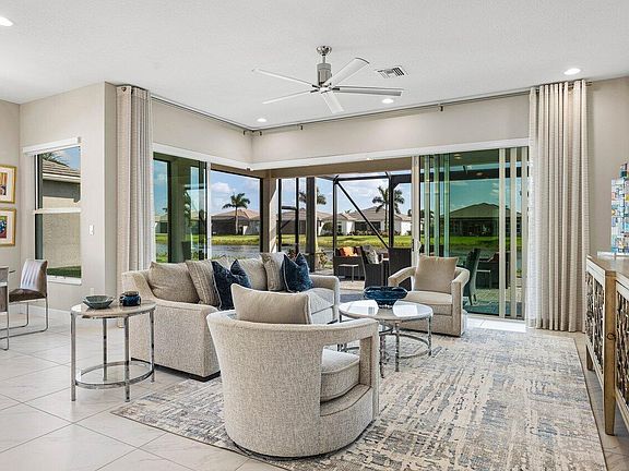 Stunning Bimini model features 3 bedrooms + a den, 3 baths and a large screen-enclosed patio overlooking a lake with fountain views. Located on an oversized lot, this Bimini provides highly sought after extra space and privacy. Upgrade highlights include corner sliding glass doors along the entire back wall of the Great room creating the ultimate indoor-outdoor living, 24x24 rectified porcelain tile throughout main living areas, custom Den built-in unit, tons of kitchen and bath upgrades, custom blinds throughout and motorized blinds in Great room, Primary bedroom and Breakfast area, custom closet systems, etched-glass front door with sidelight, over 40 LED hi-hats, upgraded fixtures and ceiling fans, impact windows and doors, gutters, upgrade landscaping, and so much more.