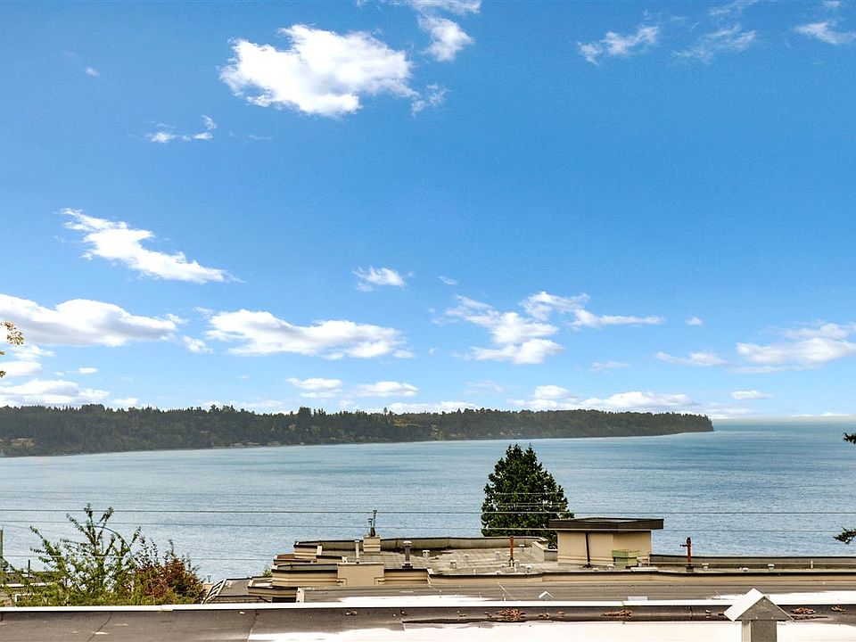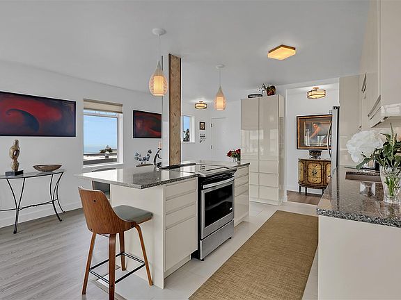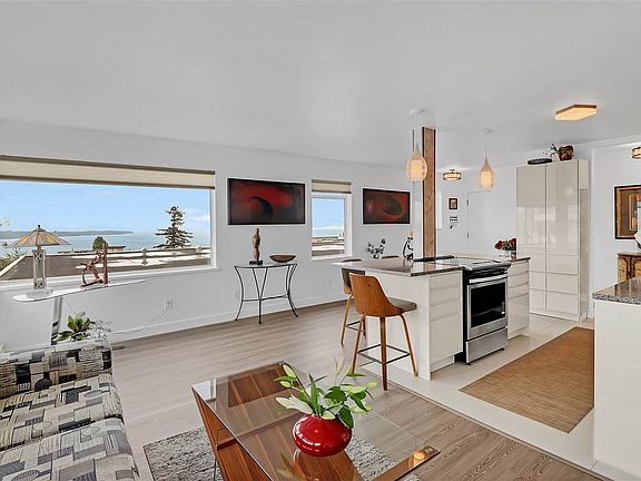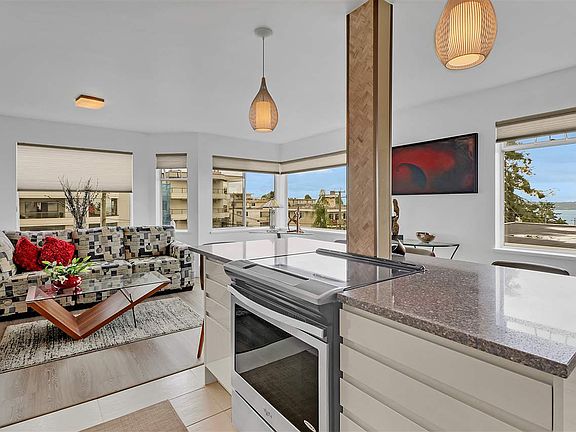 Spacious (1378 sq. ft.) two bedroom plus den, bright 4th floor penthouse (only two units on this floor) with fabulous open floor plan and outstanding 180 degree views of ocean and San Juan Island. A 7 min walk to beach and only blocks away to all amenities. This unit is fully renovated with new kitchen, quartz countertops, flooring, appliances, window coverings, window screens, light fixtures, bathroom vanities, modern gas fireplace plus more. On a hot day keep cool on your North facing shaded balcony. Great building although wood frame, has concrete between floors for extra sound proofing. This home will not disappoint. +19 building, no rentals, pets with restrictions. Please view virtual tour with commentary prior to calling for your private showing.