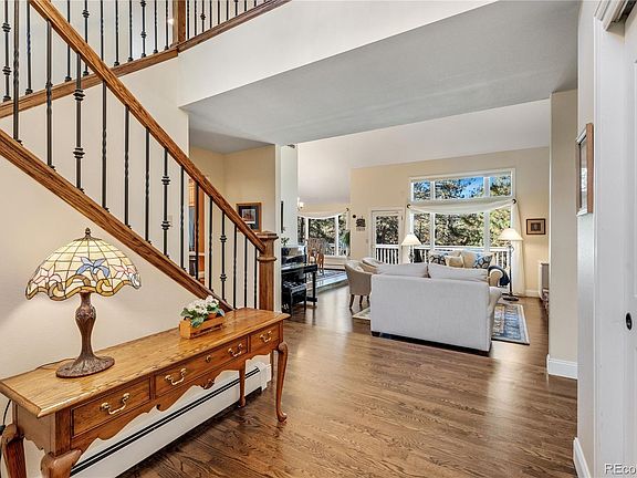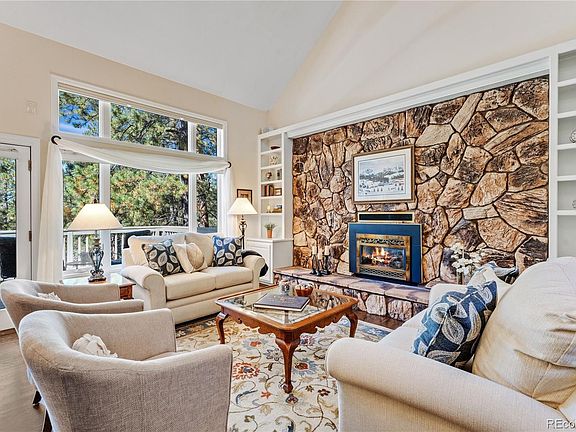 Escape to tranquility with this remarkable two-story retreat nestled on 4.5 acres of blissful Franktown terrain. Embraced by a stunning canopy of trees, this immaculate abode offers a serene ambiance and unparalleled privacy. Step inside to discover a meticulously maintained interior boasting 4 bedrooms, 4 bathrooms, and hardwood floors that flow seamlessly throughout the main level. The updated kitchen is a chef's delight, featuring a granite island, Corian counters, maple cabinets, and newer appliances including a fridge and dishwasher. Three fireplaces add warmth and charm to the home, with a private library offering a cozy wood-burning escape. Upstairs, a versatile loft provides additional living space, while the finished walkout basement boasts a gas fireplace and an exercise room, perfect for unwinding or entertaining. Outside, a wrap-around deck invites al fresco dining amidst the tranquil beauty of a ponderosa pine forest. Marvel at starry nights and abundant wildlife, with every window offering picturesque views of nature's splendor. The kitchen eating area is a haven for birdwatching, while a water feature adds a soothing soundtrack to the main floor primary bedroom. This idyllic retreat is complete with a park-like front yard, a 3 bay exterior outbuilding with one heated bay currently used as a workshop, and five garage bays for hobbies and toys. Additional highlights include a basement hobby room, a 30 amp RV pad, and the potential for a guest suite apartment. Recent upgrades include James Hardy fiber cement siding, a concrete tile roof, and a programmable sprinkler system for the lush yard. The home is also wired for an emergency generator of critical circuits and has underground invisible fencing for pets. Experience the epitome of peaceful living with this exquisite property, where every detail exudes quality and tranquility. Don't miss the opportunity to make this your forever home. Schedule your showing today!