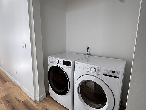 Includes in-unit laundry, a minisplit HVAC system, and a kitchen with sleek stainless-steel appliances.