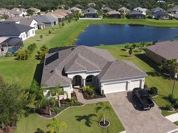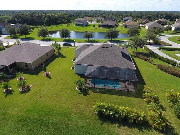 ARUBA model built by Medallion homes in 2014. This home is positioned on a corner lot, has a 3 car garage with epoxy painted floors and a lovely view of the lake from the lanai and solar heated salt water pool. This great room/kitchen concept home features granite counter tops and plenty of room for more than one good cook. All tile in this home is set on the diagonal and is beautifully accentuated by 8 inch baseboards. The home has a security system and a whole house water purification system. The spacious master bedroom/bath features private access to the pool/lanai area and has upgraded lighting, beveled mirrors and tile accents in the walk in shower. Yes, there is also a lovely garden tub for soaking away your cares. AND..talking about curb appeal! This homes driveway is both painted and stamped with 4 ft squares on the diagonal and a very Celtic looking geometric design. The landscaping is tastefully framed with precast concrete curbing. This home is located 1/4 mile from the new Ft Hamer Bridge (scheduled to open 2017) complete with a boat ramp. You can enjoy quick access to the Lakewood Ranch community and be close to shopping, restaurants and the University Town Center Mall. Bring your dreams, your boat, your paddle board and kayak! This home has it ALL!
