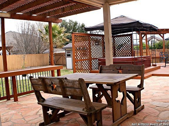 Spacious Helotes Home on Culdesac Street! Enjoy Outdoor Entertaining on over 675 sq.ft Deck & Patio! Lanai, Hot Tub, Flagstone Seating Area! Storage Shed w/Electricity! Family Room Boasts Stone Fireplace & Wood Laminate Flooring! Spacious Bright Kitchen w/Gas Stove, Island, Blt In Microwave-Open to Formal Dining, Breakfast & Family Room! Secondary Bedroom Downstairs w/Full Bath & 2 Closets! Enormous Master Suite w/Sitting Room, Separate Garden Tub & Shower & Vanities! Water Softener & Much More! Don't Miss It! Upstairs HVAC Coil replaced 8/2010; Water Softner 2008; Water Heater Replaced 1/2013; Dishwasher replaced 2/2011; Microwave replaced 2012. Gated Community with Pool, Clubhouse, Tennis Court, Basketball Court. Northside ISD (Kuentz Elementary, Hector Garcia Middle, Oconnor High School)