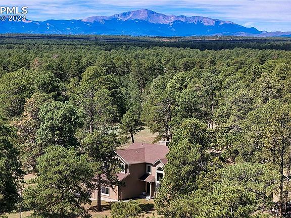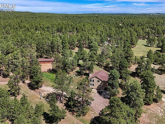 Wonderful home nestled in the trees on 11 acres in popular Latigo area! 8 minutes from shopping, restaurants, golf, and more in fast growing Falcon. Easy commutes to Springs, Denver, and bases. Updated/remodeled this two story is tucked back with country living and city conveniences. 24x48 four stall barn with tack/hay storage, 62x110 arena plus cross fencing. As you enter the property with towering ponderosas with grassy meadow and great pasture, the home is tastefully done with luxury vinyl plank flooring, new carpet, new hot water heater, Anderson windows, new dishwasher/disposal, and 2021 septic field & hot water heater. The main level has formal living/dining, family room, kitchen, office, laundry and leads to a 2 car garage. The basement has a large family room with additional bedroom and full bath plus a craft/flex room. The upper level consists of the primary with five piece bath and two additional bedrooms and bath. The outside is a park like setting and extremely private with a fabulous barn but could be multi purpose along with a riding arena. Also, a hay barn with tractor parking plus a garden shed. A large back deck for wonderful evenings and entertainment complete with hot tub wiring. Quiet, secluded, private and move in ready.