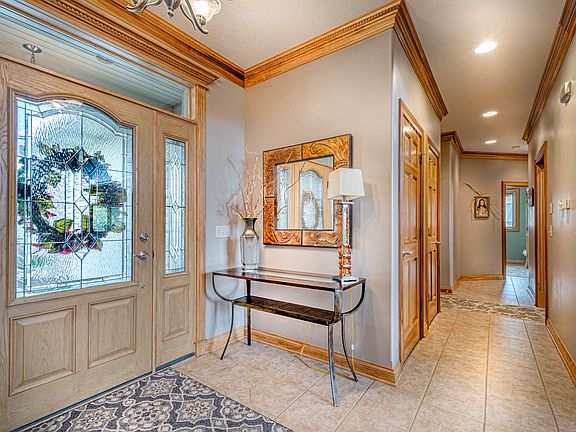 - Breakfast Bar, Beamed Ceilings, Crown Molding, Entrance Foyer, Bar, Countertops-Solid Surf, Stand Up Shower, Split Br Floor Plan, Twin Sink Vanity, Natural Woodwork, Built-In Entertainment Ct