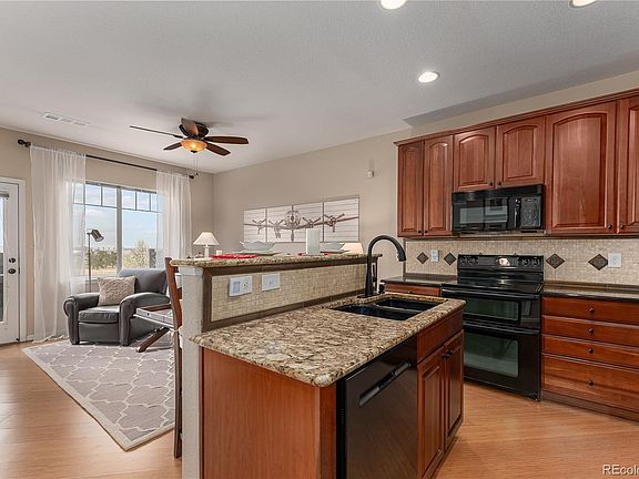 Former model home loaded with upgrades that won't disappoint. Bamboo flooring throughout the main level with cozy living and dining rooms accented with a double sided fireplace. Great entertaining space off the kitchen with granite island and quartz counters featuring a decorative tile backsplash and black appliances that include a new refrigerator and dishwasher. Enjoy the outdoors on the private deck with small fenced yard adjacent to open space and with views of the golf course. A small desk nook is located at the top of the stairs. The master suite features a three sided gas fireplace with a retreat great for an office or reading nook. Relax in the luxurious full master bath with double sinks, granite countertops, soaker tub and custom tile work. Stunning design and decor that makes this property truly turnkey. Community pool and great location close to I-25 and shopping. Seller paying for a one year Home warranty with Freedom Home Warranty up to $265.
