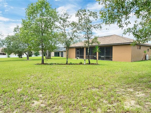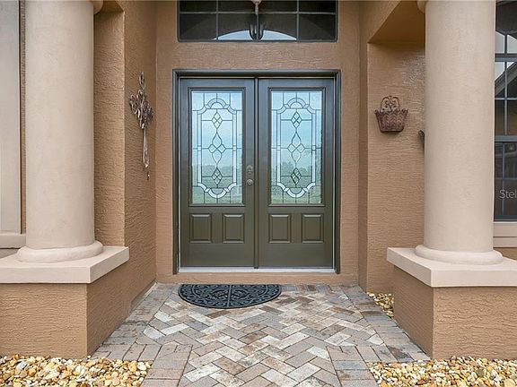 Beautifully custom designed Royal Coachman-built 3/2/3 with bonus room/home office in a Mediterranean architect setting sits on a premium lot just over one-half acre (.60) with no build behind + ubicated on a cul-de-sac. HOA fees $425 annually. Step through your double entry doors to the foyer which showcases 14 ft ceilings and opens to the great room. The kitchen overlooks the separate living room/dining room concept with a beautiful view to the outdoors. This split floor plan home boasts of a plethora of upgrades to include, ceramic wood flooring, crown molding, columns, archways, oil rubbed bronze faucets, bullnose wall corners, tray ceilings, voluminous ceilings, Spanish lace texture throughout, plant shelves, built-in shelving, triple panel pocket sliders, French doors, gas fireplace, decorative lighting, pavered front drive, entry and back lanai, tile roof, and more! The expansive kitchen is a cook's dream which features stainless steel appliances, built in oven and microwave, cooktop with hood, Quartz countertops, breakfast bar with decorative corbels and kitchen nook. The master suite includes his and her walk-in closets with dual Quartz his and her vanities, walk in shower, separate garden tub and washroom. Windows feature LLumar safety and security window tint with UV protection. Indoor laundry w/ cabinets and HE pedestal washer and dryer. All walls integrated with an in-wall pest system. Back patio screened lanai is quaintly situated where you can dine al fresco. Gracious backyard prepared with a playhouse cottage and oversize 3 car garage. Irrigation. This home has a distinct level in pride of ownership and has been meticulously maintained. Sand Ridge is a gated and deed restricted community.