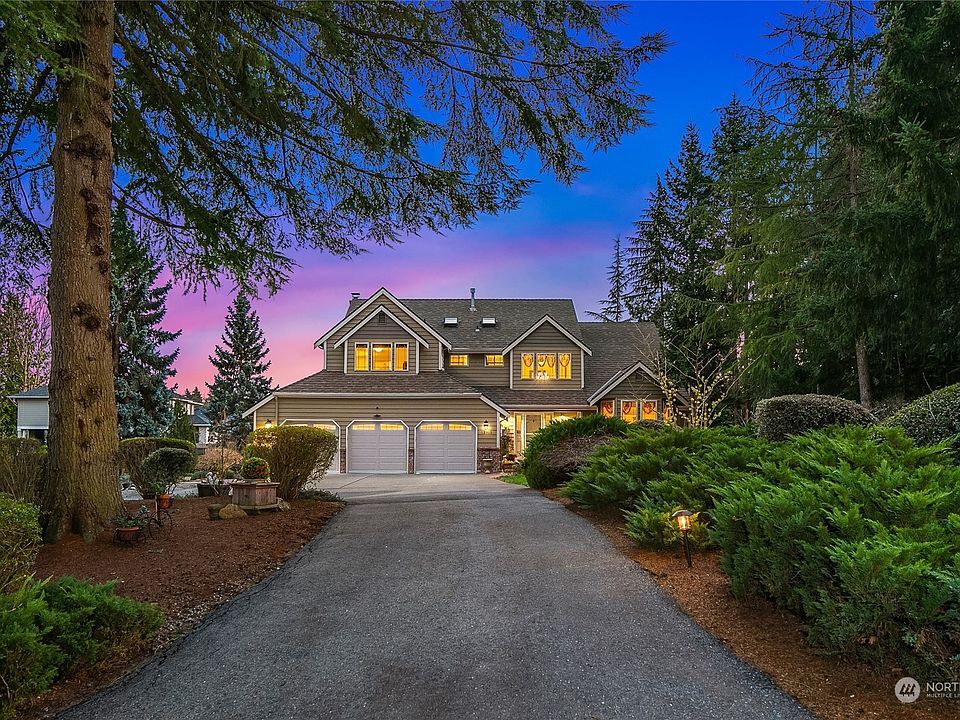 Meticulously maintained home creates ideal backdrop of picturesque sunsets. Private & secluded home & 24x24 shop located on 1+ acre; Nestled in the trees w/sprinkler system. Expansive entry leads to living rm w/cozy gas FP to formal dining rm. Chef's Kitchen hosts extensive cabinets & cupboards, full height backsplash, pantry, SS appliances, Lg island w/granite counters & breakfast bar. From Living rm w/Wood FP, retreat to pristine mature landscaped oasis w/established gardens. NEW H2O tank, A/C, Solar Panels, Furnace. Upstairs lead to primary suite-recently remodeled bath w/jetted tub. Add'l 3 Lg bdrms & 1.75ba. Gated entry to detached shop w/covered 24x24 patio, wood stove, pwr/water & 3 Tuff sheds. 3-car gar w/ample storage - No HOA