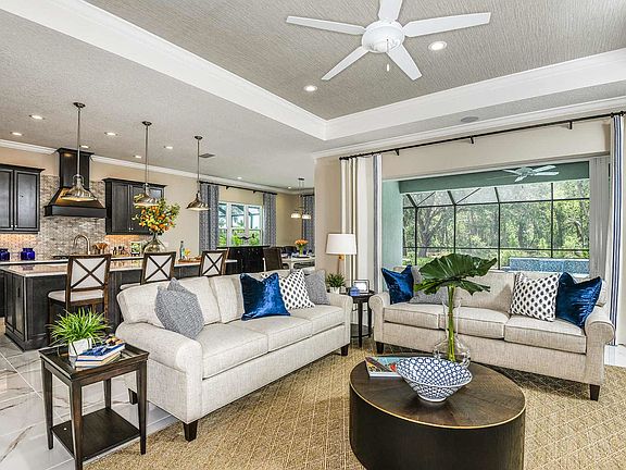 This spacious new home design in Indigo is perfect for family as well as guests. The Silver Sky 2 home includes a guest room with ensuite bath and walk-in closet, a luxurious master suite and two secondary bedrooms. An open leisure room can instead be a den with French doors. The foyer and gallery entry makes an elegant impression and leads to an open great room, kitchen and dining nook area. The great room with coffered ceiling offers views out to the sunny covered lanai, where you can add an optional pool bath. A large island and walk-in pantry make the gourmet kitchen especially accommodating. In the comfortable master suite you'll find a bedroom with coffered ceiling and optional door to the lanai, two walk-in closets, and bath with dual sink vanities, shower, optional garden tub, and private water closet.Visit this beautiful neighborhood in Lakewood Ranch and imagine your future here. Call to learn more and schedule your appointment.