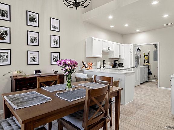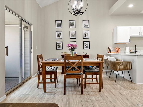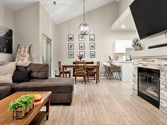 Welcome to your dream condo conveniently nestled near I-25 in the bustling neighborhood of Hunters Glen. This modern 2-bedroom, 2-bathroom unit boasts a chic open floor plan with high ceilings and ample natural light, creating an inviting ambiance from the moment you step inside. The recently remodeled kitchen and bathrooms showcase contemporary finishes and fixtures, elevating the overall aesthetic. The new light fixtures add a touch of luxury to daily living. Enjoy the prime location near Hunters Lake and surround yourself with scenic walking trails, perfect for outdoor enthusiasts as well as the 10 minute drive to Denver Premium Outlets and Thorncreek Crossing for a plethora of shopping, dining, and entertainment choices. Benefit from proximity to the Amazon distribution center, ensuring swift delivery of packages. The monthly HOA fee includes water usage, trash service, and a community pool and hot tub. To bring even more peace of mind to you as the future homeowner, the seller is offering a one-year Home Warranty. Seller is also willing to negotiate the mounted big screen TV in the living room.
