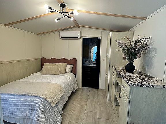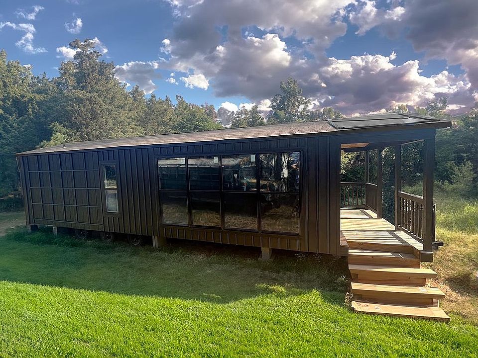 Charming tiny home for sale by owner—never lived in and ready for its next chapter. Listing does not come with Land. Buyer must move to their own location. Located in Dripping Springs, this beautifully crafted 430 sq. ft. casita-style tiny home offers a perfect blend of comfort, style, and functionality. Whether you’re looking for a cozy retreat, guest house, private office, or minimalist dream home, this unique space is built to impress. With stunning 11-foot panoramic windows, this home is designed to maximize natural light and showcase breathtaking views. While it has wheels for relocating, it is not designed for mobility but can be placed on leveled ground with removable wheels, giving you flexibility for a permanent setup. Interior features include herringbone flooring, concrete countertops with a calavera marble finish, a striking stone wall pillar, and an arched doorway that adds character and charm. The ceiling beams create a sense of spaciousness, while tiled walls and a tiled bathroom floor offer easy maintenance and modern appeal. The kitchen features a double pan sink, never-used 2023 stovetop and fridge, and ample storage with closets and drawers throughout the home. A walk-in shower provides a spacious and comfortable bathing experience. For year-round comfort, the home includes two Chigo heating and cooling AC units. Sliding glass mirror closet doors enhance the sense of space, while windows with pull blinds offer privacy and light control. The home is equipped with multiple outlets, a water heater with an easy hose connection, and washer and dryer hookups in the closet. Two smoke detectors provide added safety. The 11-foot panoramic windows are a standout feature, bringing the beauty of the outdoors inside. Whether placed in a wooded retreat, near a lake, or overlooking rolling hills, this home is designed to make the most of its surroundings. Outdoor features include a front porch with an electrical outlet and deck, perfect for relaxing or entertaining. Modern amenities such as TV and cable outlets and stylish light fixtures enhance the living experience. While this home is not designed for regular mobility, it is on wheels for transportation and can be relocated to your ideal setting. Once placed, the wheels can be removed for a more permanent installation. Septic connection tubes are included for easy setup. The sleek black exterior paneling gives the home a modern, sophisticated look. Its versatile design makes it ideal as a primary residence, guest house, pool house, retreat, home office, or creative space. It could also serve as a barn, clubhouse, or personal getaway such as a man cave or she shed. This never-lived-in tiny home is a rare find, offering high-end finishes, a thoughtfully designed layout, and expansive windows that create a bright and inviting space. Buyer must move to their own land or lot. Serious inquiries only. Don’t miss this opportunity to own a beautifully designed, move-in-ready tiny home. Contact us today to schedule a viewing!