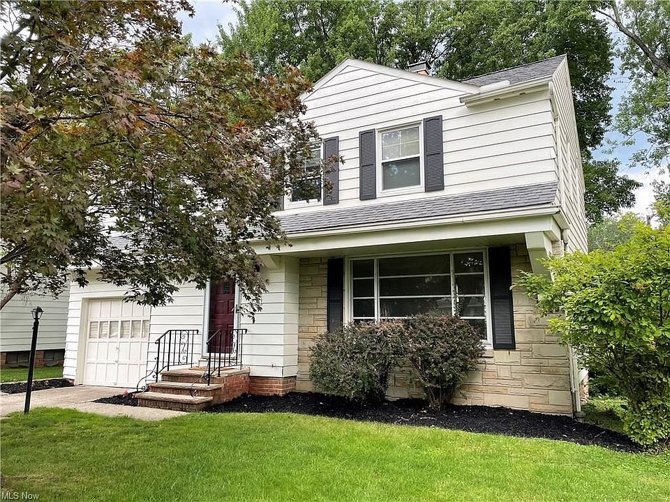 Fabulous, well maintained colonial well located east of Brainard in Lyndhurst! The front tiled foyer leads to a large living room with FP and a dining room with gleaming hardwood floors and built-in cabinet. Eat-in updated kitchen with new white Shaker cabinets, granite counters and ceramic tile floors off the dining room. Enjoy morning coffee or summer meals in the three-season sun room. Three spacious BRs on the second with great closet space, new carpet (2021) and an updated full bath (2008). Finished lower level recreation room for additional play or entertaining space! Sprawling back yard with mature trees. Attached garage and first floor updated (2008) half bath. Other updates include roof (2008), windows (2015), hot water tank (2010) and more! Five minutes to tons of shopping on Mayfield or Wilson Mills. Good proximity drive to Cleveland Clinic, Case Western, University Hospitals and more! Welcome Home!