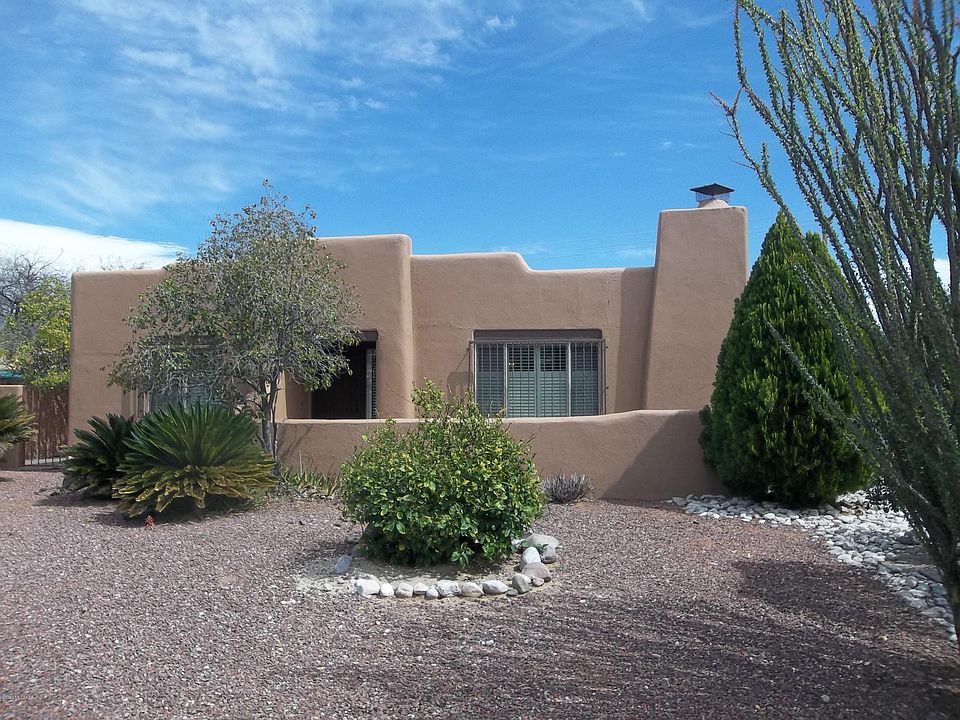 Must see this great sparkling home in desirable Pueblo style, private 44 home subdivision. 3 BR, 2 BA, light and bright floor plan with beehive fireplace, tile throughout, plantation wood shutters. Ceiling fans in every room. Skylights add to light and comfortable living. Light, spacious kitchen with walk-in pantry. Remodeled bathrooms, one with walk-outside drying area. Expanded walk-in master bedroom closet, unique for neighborhood. 2 car garage with built-in storage and cabinets. Screened in back porch with matching stucco walls offers nice outside entertaining. Finished backyard with artificial grass, slate, flagstone and storage shed. Gated side yard for great dog run. Close to Trader Joes, river walk and great route down Mountain Ave to UofA. Listing agent is related to the seller.