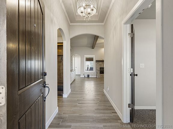 Beautiful full brick one level home built in 2020 in Cooper Landing! Split plan with 4 beds or 3 bed + Study, 2 full baths, mud room and 3 car garage. Open floor plan with high ceilings with beams. Great room with stone gas log fireplace & built-ins. Kitchen with quartz counters, island with seating, stainless appliances & walk in pantry. Dining has wainscoting & large picture window overlooking backyard. Separated Master bedroom with tray ceiling & crown molding. Master has a private bath with a corner garden tub, separate shower and separate vanities. Large master closet connects to the laundry room. 2 additional bedrooms with walk-in closets & hall bath. Situated on a 1/2 acre with wonderful covered front porch and a screened in back patio with an added concrete area. Shed on property stays but you can build your own new Shop. Located in highly desired Collinsville Schools. Great location with easy access to Highway 75! Approximately 18 minutes from the airport or downtown Tulsa, 15 minutes to Owasso’s Restaurants/Shopping & 22 minutes to Crystal Bay Marina on Skiatook Lake!