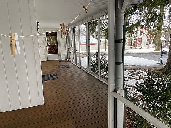 Village of Alden Century home on 2+ acres providing both privacy and Village shopping and services within a short walk. The house sits approximately 115' back from the road. Recent professional repaint of the downstairs. Very large country kitchen with rustic oak hardwood floors, tons of cupboards including a pantry cupboard, a coat closet, and granite countertops including a desk/computer area with custom bookshelves. A patio door leads from the kitchen to the 36' screened in front porch with cedar floor. Adjoining the kitchen is a master bedroom with a vaulted ceiling and pergo laminate floor. It has both its own entrance/exit to the rear and a patio door that opens completely to the screened front porch. There is a laundry area in the bedroom and a large walk in closet. Across from the bedroom is a full bathroom with a tub sized shower and a corian countertop with a make up area and a large linen cabinet. There is a pocket door between the kitchen and the front hall entrance. The living room is a combined sitting and dining room that makes for an approximate 29' by 11' room. Upstairs via the staircase, there are three bedrooms all having a closet. There is a second full bath with tub/shower. All the windows throughout the house were replaced with solid vinyl insulated windows that tip in for easy cleaning. The basement is absolutely dry and there is a finished room in the basement and has a newer hot water tank and water conditioner. The 95% high efficiency forced hot air furnace and A/C unit were installed professionally in 2021. The wiring has been largely updated and there is a newer service cable and a 200 amp breaker panel. The 936 square foot garage built in 2003 has a 100 amp service subpanel, three large bays with one providing for an auto lift with a vaulted ceiling. There is also a staircase to attic storage in the garage, and the garage is heated. There is a two story old barn that is used for additional cold storage for machinery etc. There is a 21' round pool with a deck in the back yard, and there is a large patio at the back of the house. The house is surrounded by mature pines and hard maples that provide shade in the summer.