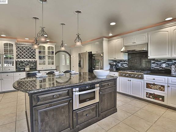 Beautiful trilevel, 4 bed, 3 bath San Ramon home backing to rolling hills. 1 bedroom and full bath on bottom level with remaining bedrooms and bath on upper level. Large gourmet kitchen, double ovens, wine fridge. Vaulted ceilings, custom tile baths with a private backyard oasis! Pool & built in BBQ. Solar panel cut utility the costs! Owner pays for Gardner and pool service