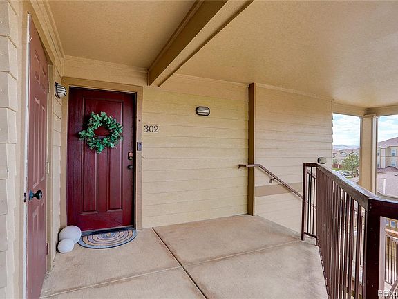Welcome home to an absolutely stunning, completely updated, Ironstone Condominium. Located on the top floor, this two bedroom, one full bath home features a covered deck with gorgeous mountain views and majestic sunsets! Upon entry, one is greeted with wood-like tile flooring that extends throughout the entry, walkways, kitchen, and dining room. The kitchen has been remodeled with new cabinets, quartz counters, stone backsplash, trash compactor, soft-close doors/drawers and black appliances. There is also a walk-in pantry and storage area off the kitchen. Open to the kitchen lies a cozy family room with vaulted ceilings and a gas fireplace with custom tile surround for those cold Colorado evenings. The spacious dining room has access to the covered deck for extended outdoor living. A large, walk-in closet adorns the primary suite which has direct access into the fully remodeled, five-piece bath. This bathroom, shared with the second bedroom, has been completely updated as well with new cabinetry, dual vanities, custom tile surround in the soaking tub, and beautiful stone floors. The secondary bedroom conveniently lies across from the bathroom and provides additional access to the amazing deck. There is a smart washer and dryer, Nest thermostat, and Ring doorbell which all stay with the home. As for the systems, the water heater, furnace, and AC were all new in 2018. Located directly outside the front door is a wonderful storage closet with shelving for all your storage needs. Two parking passes plus one guest pass are provided with this home. There is a community pool, clubhouse and fitness center in the neighborhood, a King Soopers just down the road, and downtown Parker with all its amenities is only a short drive away!