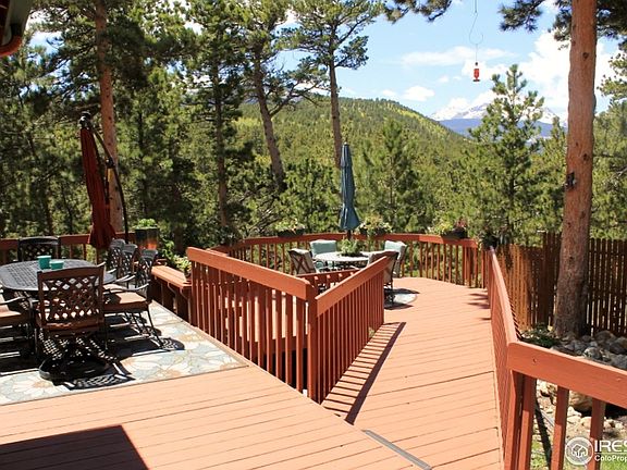 This custom River front mountain Estate sits on over 2.5 acres is located close to the Wild Basin entrance to RMNP + part of the St. Vrain River runs through the property! Features a bright recently remodeled kitchen with high-end finishes & new stainless-steel appliances including: Double oven, gas cook top, built-in microwave & refrigerator! Has its own well! Has recently had the exterior painted! New roof on main house & detached garage! RV parking with hookups! 2-sided stone fireplace! Huge wraparound deck! Detached and attached Garages with room for toys! Hot Tub included! Spectacular Mountain & River views! Has been a high performing vacation rental!