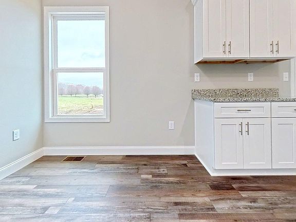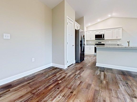 The kitchen and dining area feature beautiful cabinetry with ample storage, granite countertops, a pantry, and stainless steel appliances. The living area is highlighted by vaulted ceilings, adding an open and airy feel.