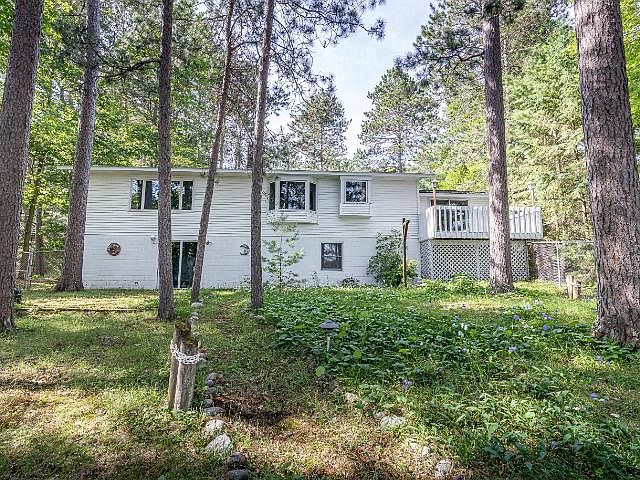 Charming home overlooking Hillis/Sharon Lake. Main floor has a roomy kitchen with an attached dining area. A double-sided fieldstone wood fireplace occupies the partial wall between dining area and living room. Also on the main floor are the Master suite with a full bath and access to the balcony overlooking the lake and two additional bedrooms and full bath. Full basement, partially finished features third full bath, laundry and utility area, and a family room with a walkout to the fenced in back yard, with a gate leading to steps down to the lake. Blacktop driveway, two car detached garage, Charter/Spectrum Cable TV & internet available. Convenient location in Arbor Vitae. If you are looking for a comfortably spacious home to realize your Northwoods dreams, this may be the place for you!