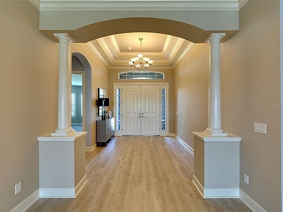 Superb & Stunning, this 3 bedroom/3 bath + Office/study Pallazio model home w/GOLF INCLUDED has high end upgrades & is meticulously maintained. Built in 2019, your discriminating buyers will appreciate the attention to detail in this popular model featuring BREATHTAKING water & golf course views. Step into the grand entrance adorned with columns, triple tray ceiling & double door entry. Sense the space as you are greeted with sunshine & step across the gorgeous engineered wood floors that flow into the Great room/dining/kitchen areas. Gourmet Kitchen features Luxury island with storage, custom white cabinetry, SS appliances & Wine Bar area with fridge. Romantic Owner's Suite adjoins luxurious en-suite bath that offers Custom Roman Shower with niches, dual vanities & spacious walk-in closet professionally done by Closets By Design. Two more-bedrooms feature plantation shutters, French door closets. Glorious Golf & Lake views from the screened paver lanai & most rooms in the home. Other notable features include the 2-car garage with 4' extension, guest bedroom two with en-suite bath, study w/pocket doors, tankless water heater. Amenity rich, Esplanade Golf & CC includes a Social Director, 2 Pools/Spas, 2 Fitness Centers, Walking Trails, Golf, Tennis, Pickleball, Bocce ball, Firepit, Kayaking, Wellness Center for Facials, Massages, Hair/Nails, Poolside Bar/Restaurant, Culinary Center with Fine Dining, Bar, Wine Tastings, & more! Just 1 year young, save the additional expense of new construction costs. Live your dream today!