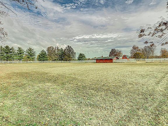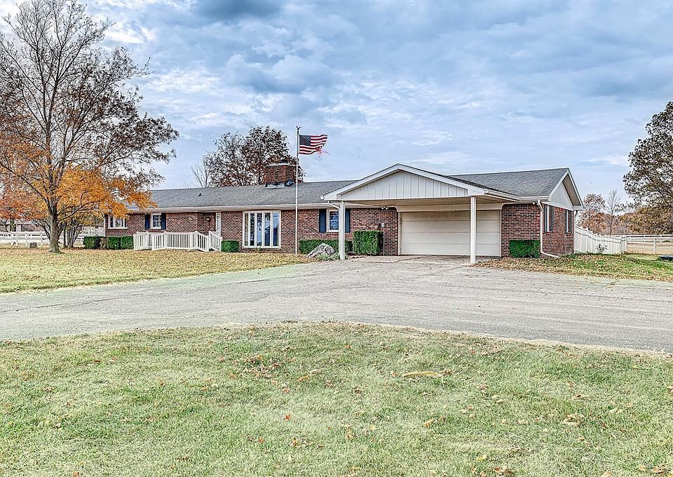 Brick ranch 3 BR 2 full baths, sunroom, family room with double sided fireplace, oversized 2 car attached garage. Horse barn with fenced paddocks, two story storage shed, and vinyl fencing.