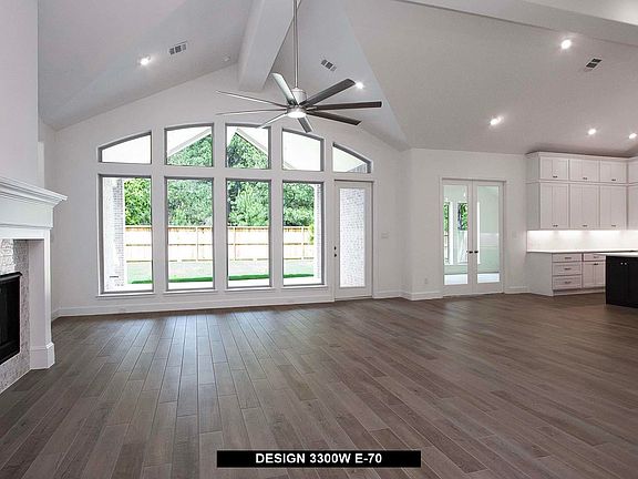 Home office with French doors set at entry. Formal dining room with abundant natural light. Open family room with a wood mantel fireplace and wall of windows flows into kitchen and morning area. Private guest suite with full bathroom and linen closet adjacent from the morning area. Kitchen features island, double wall oven, 5-burner gas cooktop and walk-in pantry. Secluded primary suite with curved wall of windows. Primary bath includes garden tub, separate glass-enclosed shower, dual vanities and two deep walk-in closets. Secondary bedrooms with walk-in closets connect with a Hollywood bathroom. Game room with French doors and wall of windows. A utility room, abundant closet and storage space complete this floorplan. Extended covered backyard patio. Mud room just off the three-car garage.