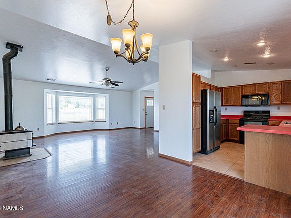 Welcome to Northern Arizona! This charming three bedroom, two bathroom home is a great fixer upper complete with an open floor plan, laminate flooring, wood burning stove, bay windows with gorgeous mountain views, ample kitchen storage and spacious bedrooms. The primary bedroom boasts a double vanity, tiled shower and tub and plenty of closet space. Enjoy the covered patio and lush landscape the backyard has to offer, where you can relax and watch the sun set. Less than 10 miles from shopping, restaurants, entertainment and more, this house is the perfect escape from the bustling city.