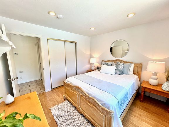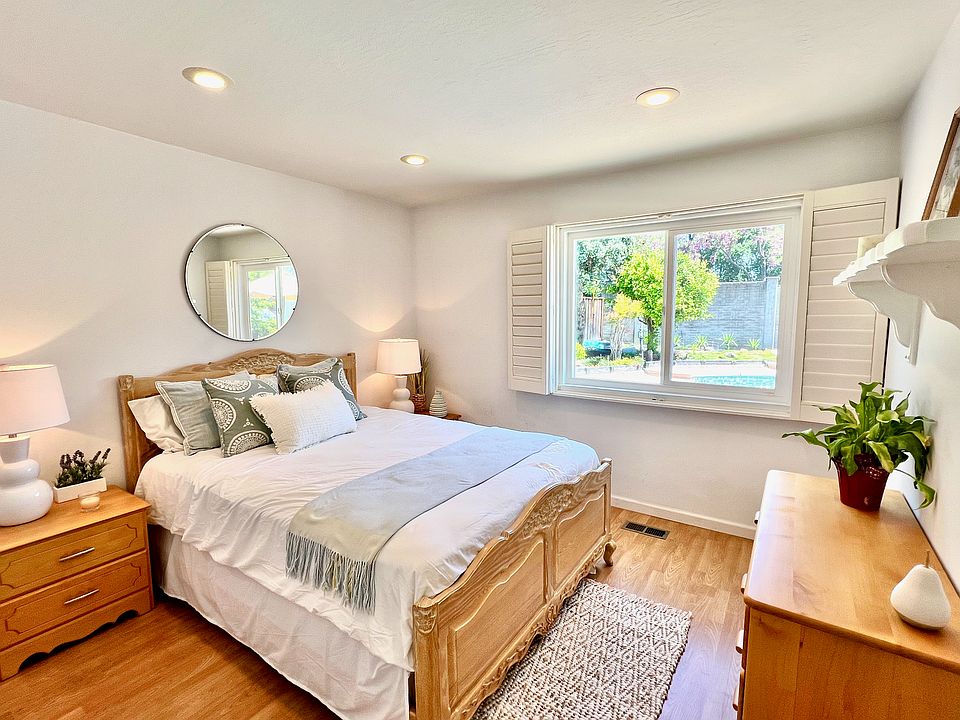 Light filled one bedroom, one bath in attractive San Ramon neighborhood. Rental is entire floor of home. Recessed lighting and maple laminate throughout. Tile flooring in bath and entry. Double paned windows throughout. Attractive plantation shutters on windows. Bedroom enjoys view of yard and pool. Spacious living room opens to pool through large slider. Kitchen is shared with friendly owner and 2 roommates. Full sized washer and dryer in house. Unit can be closed from rest of house if desired, and is accessed through private entry or main door to house. Premises are well maintained and kept clean. Ideal for someone who wants privacy while living with other people. Rented furnished or unfurnished. Plenty of street parking in front of house. Great location close to shopping, restaurants, and entertainment at The Lot. Month to month lease. Utilities are shared with roommates. Move in: One month's rent plus equivalent amount of security deposit. Month to month lease. Utilities split evenly between 4 inhabitants of house.