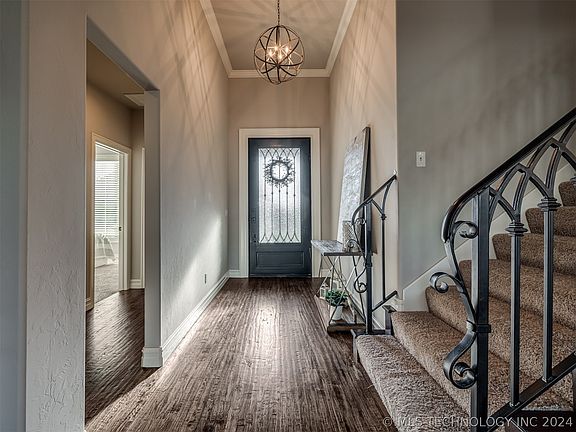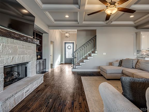 This stunning 2-story stucco home is located in the desirable neighborhood of Yorktown (Bixby Schools), with nearby swimming pools, splash pad, trails and pickleball courts (coming soon). Built by Burton in 2017 with countless “extras,” including tiled baths, hardwood floors, coffered wood & vaulted ceiling accents, and stone fireplace surrounded by built-in cabinetry. Kitchen features granite countertops, including a 6 cm breakfast bar, stainless appliances, side-by-side refrigerator/freezer and an oversized walk-in pantry. First floor also includes family room, formal dining, guest suite, hall bath, and master suite. Luxurious master bath offers soaking tub, dual vanities, frameless walk-in shower with bench, spacious closet with built-in dresser, connecting to the laundry room. Upstairs has 2 bedrooms, a hall bath, game room plus office/ hobby and a walk out attic. The 3-car garage features generous storage & epoxy finished floor. Covered patio and fenced yard perfect for outdoors entertainment! Updated with fresh paint, new island pendents and dining fixture. Seller is a licensed Realtor.