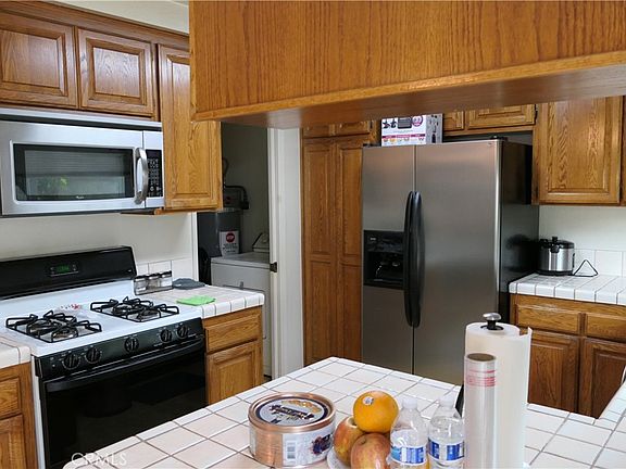 Whirlpool microwave, stainless steel Maytag dishwasher, tile counters, an abundance of wood cabinetry, large pantry, two seater breakfast bar,