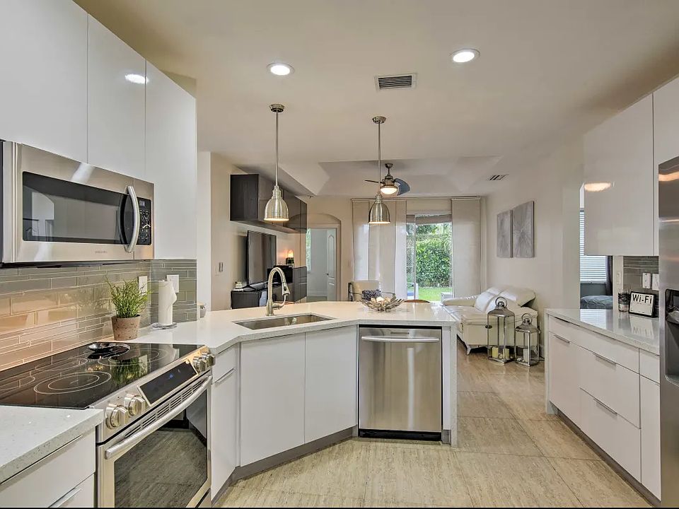 Completely Remodeled 3/2 w/36 Inch Contemporary-Style Flat Panel White High Gloss Cabinets, Recessed Hi-Hat Lighting throughout, Quartz Kitchen Countertops w/water fall edges, Brand New AC Units, Baths Include Contemporary-Style Floating Vanity w/Vessel Sinks, and LED Rectangular Mirrors & Master includes Rain Shower & High Gloss White Luxury Tub. Fenced in w/Prof Custom Design Landscape, Exterior Recessed Lighting, So many upgrades & details that make this Monarch Home an Amazing Purchase near Grade A Schools.