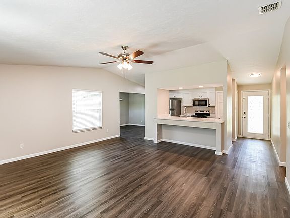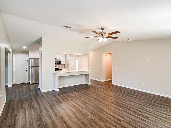 This three-bedroom, two-bathroom, recently renovated rental home in Orange Park, Florida has meticulous landscaping, including a large shade tree in the front yard. Inside this one-story home, you will be greeted by a vast open floor-plan living and dining area with a vaulted ceiling, gorgeous vinyl plank flooring, and light-colored walls. The nearby kitchen has a breakfast bar facing this space, sparkling new stainless steel appliances, and pristine white cabinets for plenty of storage. The main bedroom is in the back of the house and sports two windows allowing for lots of natural light and a generous walk-in closet to organize your clothing. This rental home also features a massive fenced-in backyard with a patio perfect for hosting barbeques. Schedule your tour today!
