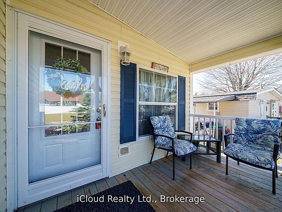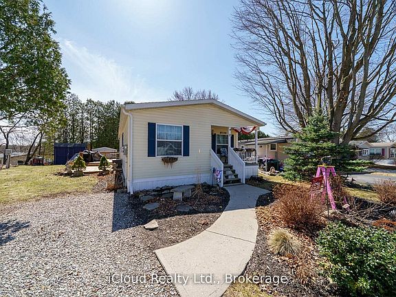 Buyer Incentive, On closing,the Seller will credit the Buyer 2 months of the landlease cost. Welcome to the exquisite Beverly Hills Estates within the vibrant Parkbridge community!This charming 2-bedroom bungalow at 23 Macpherson is surrounded by beautifully landscaped perennial gardens and features a welcoming covered front porch. Step inside to discover a spacious open-concept layout highlighted by soaring cathedral ceilings, creating an inviting atmosphere.The kitchen is a chef's dream, complete with a cozy breakfast nook, ample cabinetry, and generous countertop space. For even more functionality, a central island provides additional workspace while overlooking the sunlit living room.The home boasts two well-proportioned bedrooms with ceiling fans, with the primary suite featuring a three-piece ensuite and double closets for your convenience. An additional versatile room at the back of the house can serve as a third bedroom, office, playroom, craft space, workout area, or cosy sitting/T.V. room. The possibilities are limitless! A beautifully finished laundry room provides access to the side yard, which includes a deck and shed.The property also includes a double driveway for ample parking. As a resident of this fantastic community, you'll have access to the Recreation Centre, where you can enjoy activities like pool, cards, bingo, and darts, or host events in the full kitchen with family and friends. Adults can unwind at the horseshoe pits, adding to the sense of community and enjoyment. Conveniently located on a paved circle in a serene rural setting just off Hwy 6, this home provides easy commuting to Burlington, Cambridge, Guelph, Hamilton, Milton, Oakville, and Waterdown.You're just 15 minutes from the 401 and 403 highways.The monthly lease fee of $799.69 includes taxes property taxes, snow removal for common areas, and grass cutting. Don't miss out on calling this beautiful bungalow your new home!