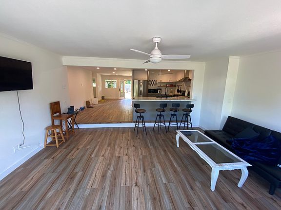 Excellent location in the quiet spaciousness of Haiku yet only a short drive to shopping, gyms, restaurants, post office in Haiku town. Recently renovated + furnished 3 bedroom 2 bathroom house with big fenced yard. Very spacious and open floor plan with lots of recent upgrades (new floors, appliances, ceiling fans, lights, paint, kitchen, bathrooms and more). Plenty of space in garage for parking / storage, covered lanai's in front and back of back of house. Property also features a large outdoor shower, private laundry, citrus trees and plenty of space inside and out. 6 month lease then extend or convert to month to month. Deposit required, pets acceptable. Landlord pays for water, trash and landscaping. Will be available April 1st.