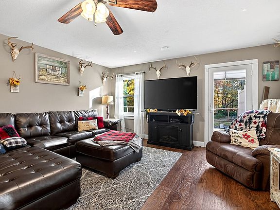 Tucked away and completely secluded from neighbors, this property offers true privacy on almost 6 acres surrounded by 2,000 acres of woods. The fully furnished home comes with everything you need — all appliances including washer, dryer, freezer, and kitchen essentials, plus furniture. Inside you'll find LVP flooring throughout, tile in the bathroom, a tile shower and jacuzzi tub, granite countertops, and an open floorplan centered around an electric fireplace. Enjoy the outdoors from the screened-in front porch or the large deck overlooking the yard with mature trees. The land features a gated entrance, 2-car garage, chicken coop, and multiple sheds for equipment storage. Recent updates include brand-new upscale windows and doors with transferable warranty and fresh exterior paint. City water and a well are both on site for convenience. A move-in-ready fully furnished retreat offering peace, space, and comfort just minutes from town.