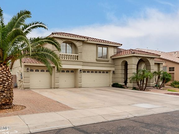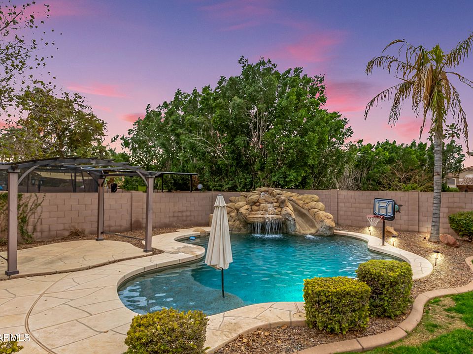 Get ready for summer! You will fall in love with the large backyard and pool with slide and waterfall grotto. The backyard also features mature landscape and a sport court. Solar panels have been installed to help with energy savings. Every room in this home is super spacious including the 4 car garage, the family room with a wet bar, the extra large loft area, and all the bedrooms including the primary suite. The spotless kitchen features stainless steel appliances, cabinets adorned with crown moulding, granite counters, recessed lighting, a prep island with a breakfast bar, and a breakfast nook. Addt'l features include newer AC units, shutters, RO system and softer water. Ideal location in Gated Litchfield Park community close to shopping, entertainment, eateries and more! Double doors reveal the oversized main retreat, complete with plush carpet, walk-in closets, and an ensuite comprised of dual sinks, soaking tub, and an enclosed glass shower. Finally, the delightful backyard highlights a full-length covered patio, pergola, and a shimmering pool with a rock waterfall. This rare find is the one you've ever dreamed of!