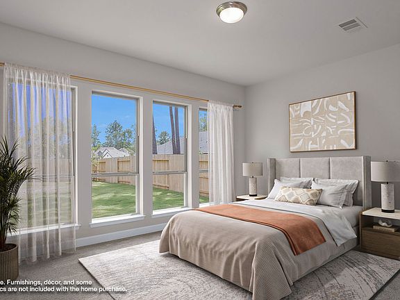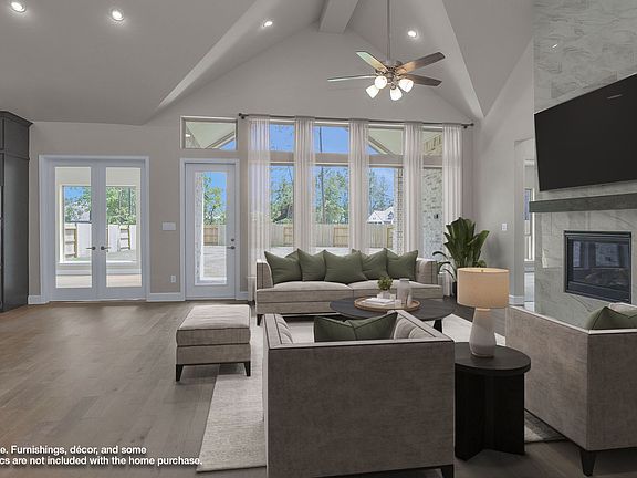 Home office with French doors frame entry. Open family room with a wall of windows extends to kitchen and dining area. Island kitchen with built-in seating space features a walk-in pantry. Secluded primary suite with a wall of windows. Primary bathroom features a French door entry, dual vanities, freestanding tub, separate glass enclosed shower, a linen closet and two walk-in closets. Large game room with French door entry and a wall of windows just off the family room. Private guest suite with a full bathroom and a walk-in closet. A Hollywood bathroom, additional bedrooms and utility room completes this spacious design. Extended covered backyard patio. Mud room just off the three-car garage. Representative Images. Features and specifications may vary by community.