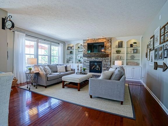 Gorgeous open floorplan, updated kitchen w/granite, ss appliances, center island; cozy GR w/ stone hearth, gas FP & floor to ceiling custom built-ins! Situated on an oversized lot with a peaceful pond setting, this backyard is a perfect sanctuary for family and friends w/ the custom composite deck, paver patio, incredible landscaping, & fire pit! The BSE will delight w/ wet bar, large rec room/entertainment space, & 15x10 of unfinished storage. Steps away from the neighborhood pool & playground!