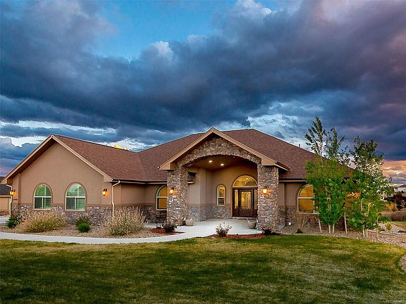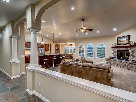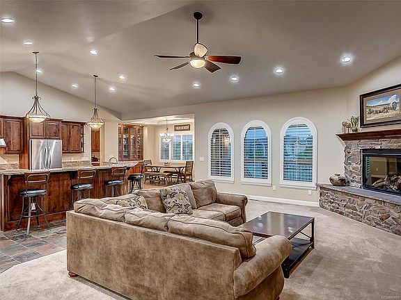 This exquisite ranch home in Glen Eagle Estates has 5 bedrooms & 5 bathrooms and includes a finished, garden level walk-out basement. With over 5,000 square feet of finished living space this home is truly one level living at its finest. You will love the gourmet kitchen equipped with gorgeous slab Granite counter tops, a double oven, a gas cook top and a large island with breakfast bar seating. The large eating space has gorgeous views of the Colorado Mountains. There is an abundance of cabinet space including a Butlers pantry w/ additional cabinets & Granite counter top. The kitchen is open to the family room with custom built-in's & a cozy gas fireplace encased in stone. The master bedroom has a gas fireplace in addition to a private 5-piece master bathroom with Granite counter tops. Even the laundry room has Granite counter tops & tile floor along with a utility sink and more cabinets for additional storage. The finished walk-out basement has a kitchen/wet bar that includes a dishwasher, slab Granite counter tops & gorgeous 16 inch slate tile floor. There's even space for a poker/billiard table. The basement family room has coffered ceilings & built-in's. You will love the covered upper level deck with views of the Colorado mountains. It's the perfect place to enjoy your morning cup of coffee. This lovely home is wired for surround sound and the 4 car attached garage even has room for an additional car or boat. This home is a rare find and you truly must see it to believe the care that it has been given since it was built in 2013. Call today for a private showing, before it gets away: 303-523-4040