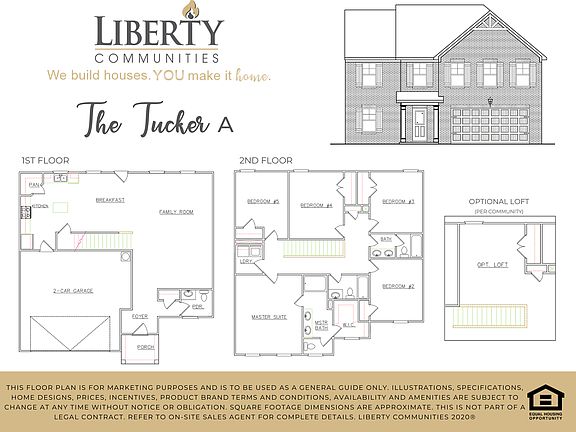 The Tucker is a new plan by Liberty Communities with up to 5 bedrooms, 2.5 baths.. The open concept design provides a large, inviting family room, dining room and kitchen with island and walk-in pantry. The master suite is located on the 2nd level and features a master bath and walk-in closet. Other highlights of this popular plan include a convenient upstairs laundry room and optional loft in place of 5th bedroom. *Home information, including pricing, included features and availability are subject to change prior to sale without notice or obligation. Square footage dimensions are approximate. Sample elevation shown.