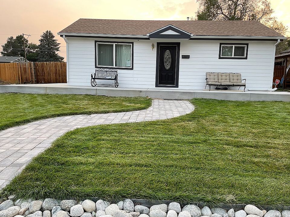 4 bed 2 bath Ranch home on a large corner lot. Lots of potential in this cozy home. New kitchen cabinets and tile. Laminate flooring throughout and some updates in the full bath. One bedroom has a private ¾ attached bath. Entertaining is easy with the large fenced in backyard. Includes a storage shed. Central location near Denver, close to retail shops, dining and parks.