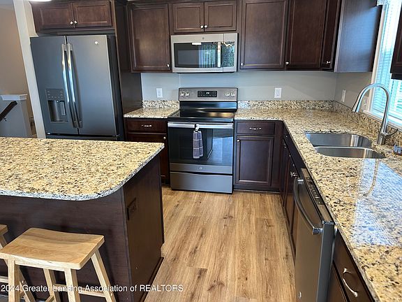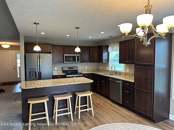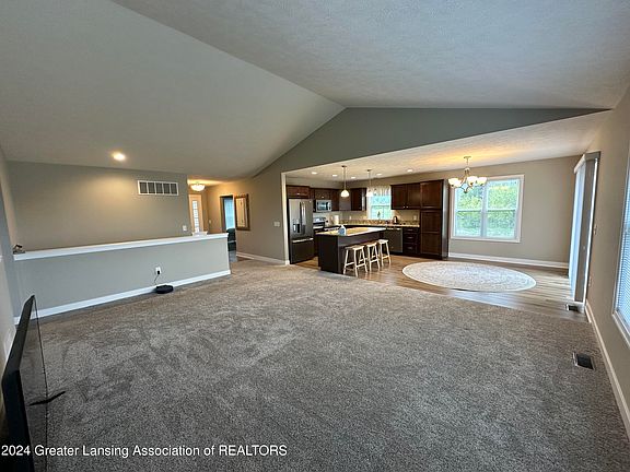 Great opportunity to own an end unit Condo with all appliances included! ADA entrance with no step into the condo! Open floor plan with cathedral ceilings and modern kitchen with island and granite countertops! Primary suite with full bath and walk-in closet! First floor laundry room and mud room off 2 car garage. Private composite deck overlooking farmland and trees. Lower level is stubbed for a full bath and has egress windows. Low Bingham Township taxes!