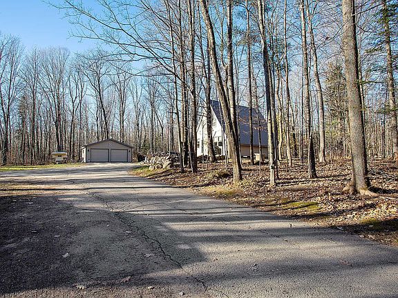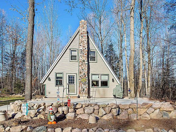 Secluded A Frame home in the woods near Bagley Rapids, Chute Pond and many trails. Minutes from Mountain yet back to nature in this setting with creek running through it. Two bedroom one bath, full basement and loft with landing. 2.5 car garage with blacktop driveway for all of your toys. Many updates in the last few years including metal roof on home and garage and concrete patio. The outdoor boiler is included.