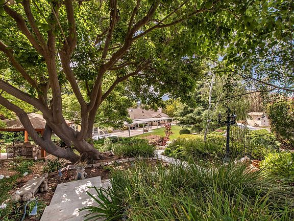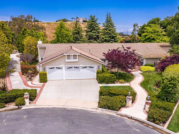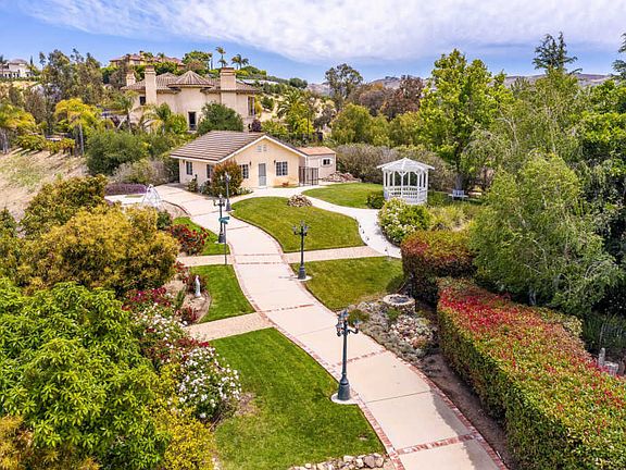 Nestled in a cul de sac, this beautifully remodeled, ONE STORY customized home sits on 1.2 scenic acres with panoramic mountain & canyon views to the Reagan Library. The home has been expanded to include a larger foyer, huge family room w/Heatilator fireplace. Stunning kitchen w/DCS Fisher/Pakel 5 burner gas cooktop, DCS dbl ovens, built-in micro, Miele dishwasher, granite counters w/travertine backsplash, large island, coffee station. Baths are gorgeous, each w/its own amenities including a claw tub secondary bath, master bath is a masterpiece w/huge shower w/3 shower heads, private commode, dual sinks, spa tub and custom vanity, organized spacious closet. Master bdrm has adjacent added 360sqft room (18x20) w/closet & half bath. This home has so many upgrades: Milgard dual paned windows, French doors/sliders, plantation shutters, pecan cabinetry, 6" moldings and features soaring ceilings. Outside, there is room to roam w/2 gazebos, BBQ center, waterfall & separate 576 (24x24) multi-use bldg. & 2 10x12 Sheds. Pathways are dotted w/roses, lavish landscape. RV access, avocado & fruit orchard. 3 car garage. Horse zoned.
