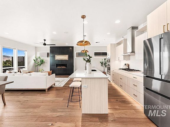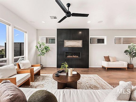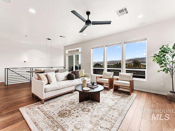 Luxury lock-and-leave townhome living with sweeping foothill views! This upscale end unit offers designer finishes, a smartly crafted layout, modern tech features, and true zero-maintenance ease. Ideally located in Southeast Boise, just minutes from Bown Crossing, the Boise River, and the Ridge-to-Rivers trail system, with direct access to downtown Boise. The light-filled floorplan boasts engineered wood flooring, a spacious great room with a floor-to-ceiling fireplace, and expansive windows framing the sweeping foothill views. Step outside to a private view deck, perfect for morning coffee or evening unwinding. The chef’s kitchen showcases a dramatic waterfall quartz island, premium Bosch appliances including dual ovens and a gas cooktop, along with a walk-in pantry and dedicated coffee bar. The serene master suite offers its own private patio with views, plus a luxurious en suite bath featuring dual vanities, a frameless glass walk-in shower, and a large walk-in closet.