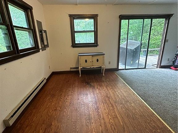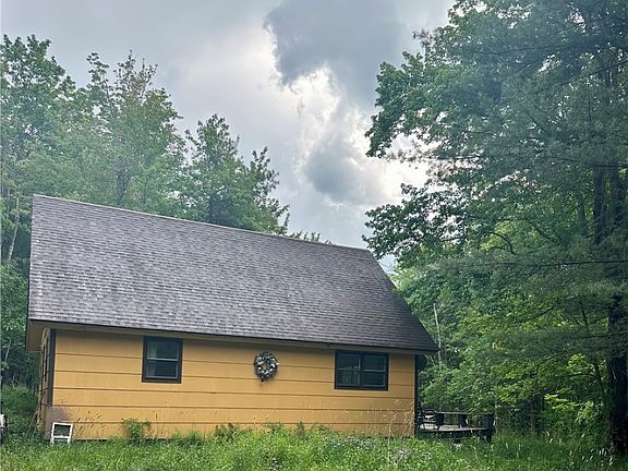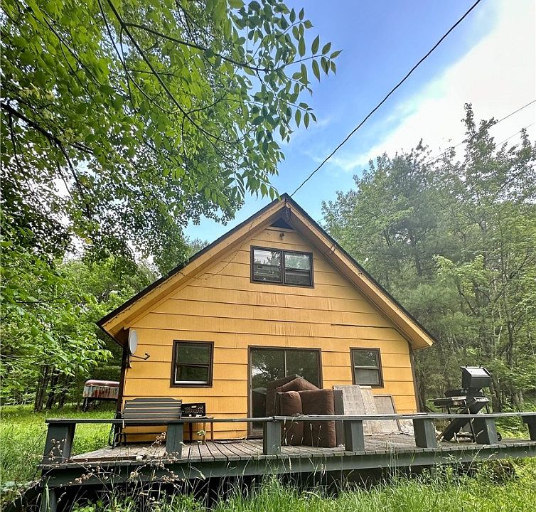 Adorable Oversized A-Frame tucked away on 2.7 acres. 3 beds, 1.5 baths with a living/dining room that has glass sliders onto a deck that overlooks one of the TWO ponds. There's a barn/garage that's 2 stories with plenty of space for storage & any hobbies.