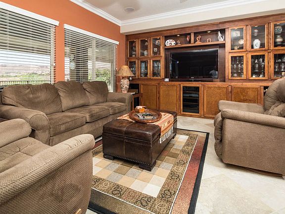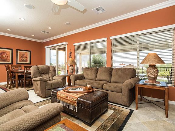 This beautiful Laurel Model (2 bedroom and a Den) which has been one of the most popular with the Del Webb Communities, over looks the South Virgin Mountains, the Beautiful Flat Top Mesa as well as established trees. A widen driveway with pavers greet you as you walk up the entrance. As you enter the home, your eyes go straight to the View. The Great Room has a Entertainment Center that is one of a kind and was featured in the View on Mesquite Magazine. Along with the view in the back, an extended Patio Cover and artificial turf, perfect for entertaining, or enjoying sunsets. This is a beautifully appointed home, with many gorgeous upgrades, too many to list!