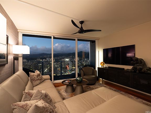 Experience elevated island living from the 46th floor at Moana Pacific! This impeccably maintained 2-bed-2-bath residence with 2 covered parking stalls is ideally positioned on the cooler Mauka side, showcasing unobstructed city views into Manoa Valley and the majestic Ko'olau Mountains-often framed by rainbows and breathtaking sunsets. Stylish upgrades include engineered hardwood floors, grasscloth wallpaper accents throughout, granite counters, stainless steel appliances, LED lighting, and built-in wine cooler. The spacious primary suite is a rare find in condo living, complemented by custom closets and an ensuite bath. The versatile second bedroom doubles as an office with a custom Murphy bed. Added comforts include central AC with a Nest system, pet-friendly policies, and resort-style amenities--pool, tennis-pickleball courts, putting green/golf driving nets, BBQ areas, ample recreation spaces and 6 EV charging stations. A perfect blend of sophistication, comfort, and island charm awaits.